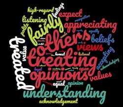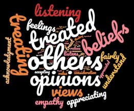 Overall, the delegates identified the main aspects of respect as treating others fairly, or understanding and appreciating others’ opinions and views. These definitions are rather divergent from the actual meaning of attitude of deference, admiration, or esteem (Collins), or a feeling of deep admiration for someone or something elicited by their abilities, qualities, or achievements (OED).