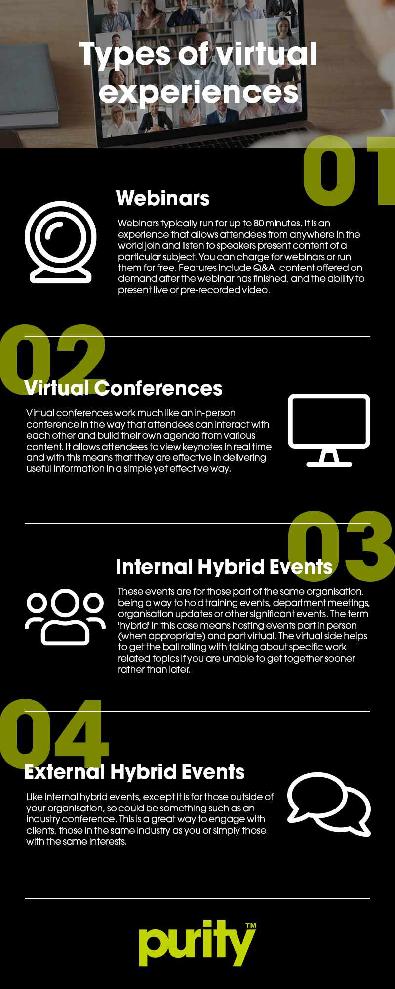 Travel bans due to a pandemic, extreme weather or other challenges mean we are now rethinking how we meet and communicate. Purity, the experiential marketing agency have produced this useful infographic to help inspire new ways of creating virtual experiences in the new reality.
